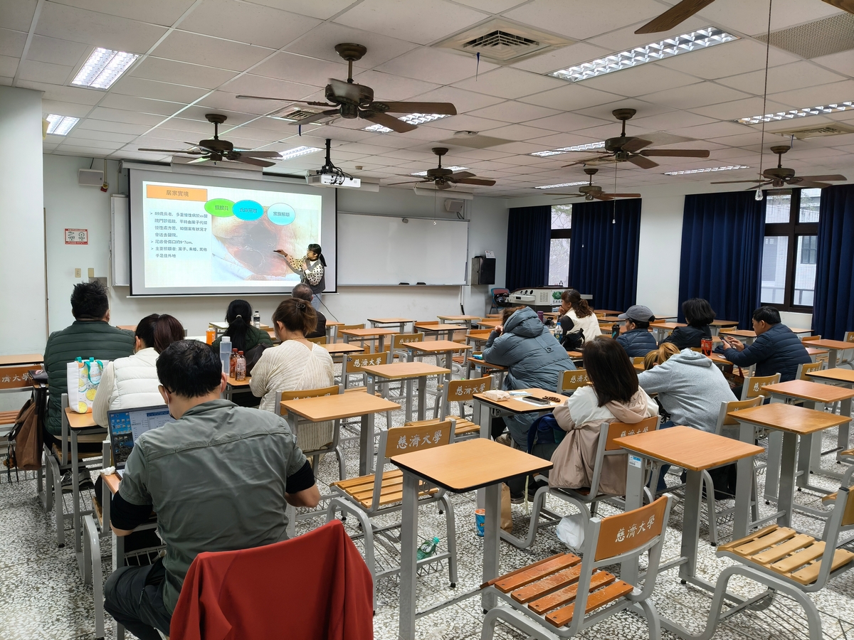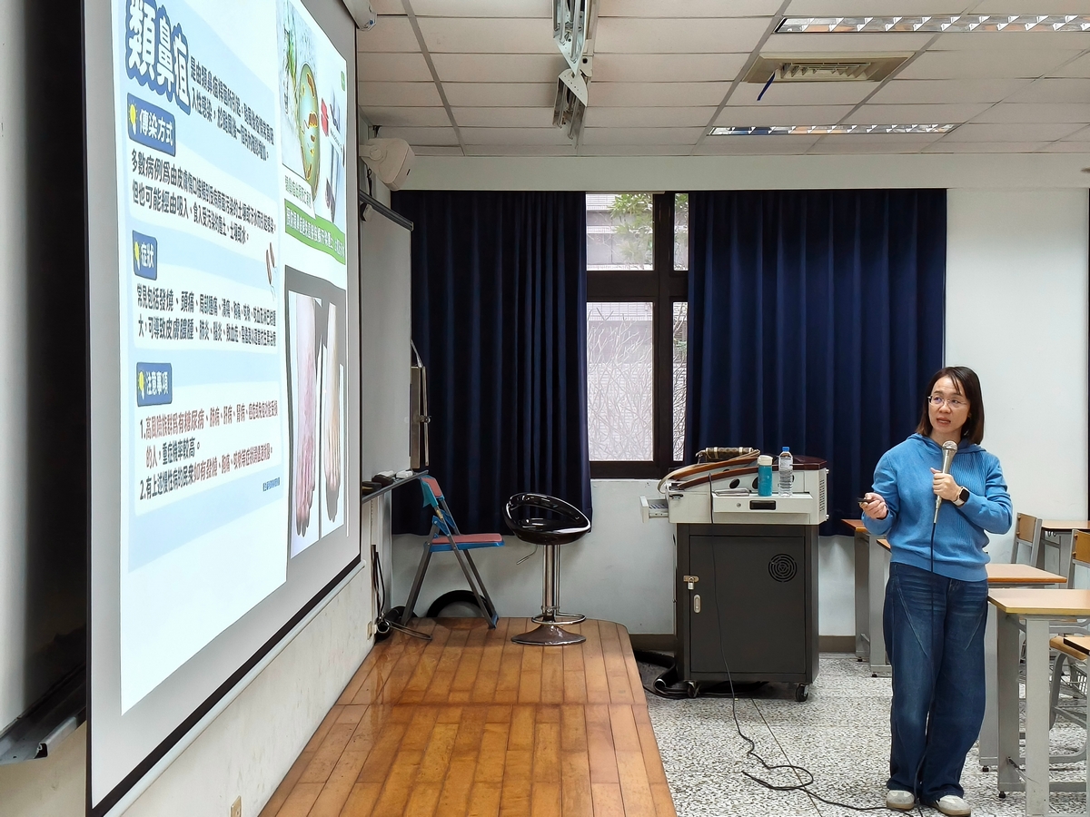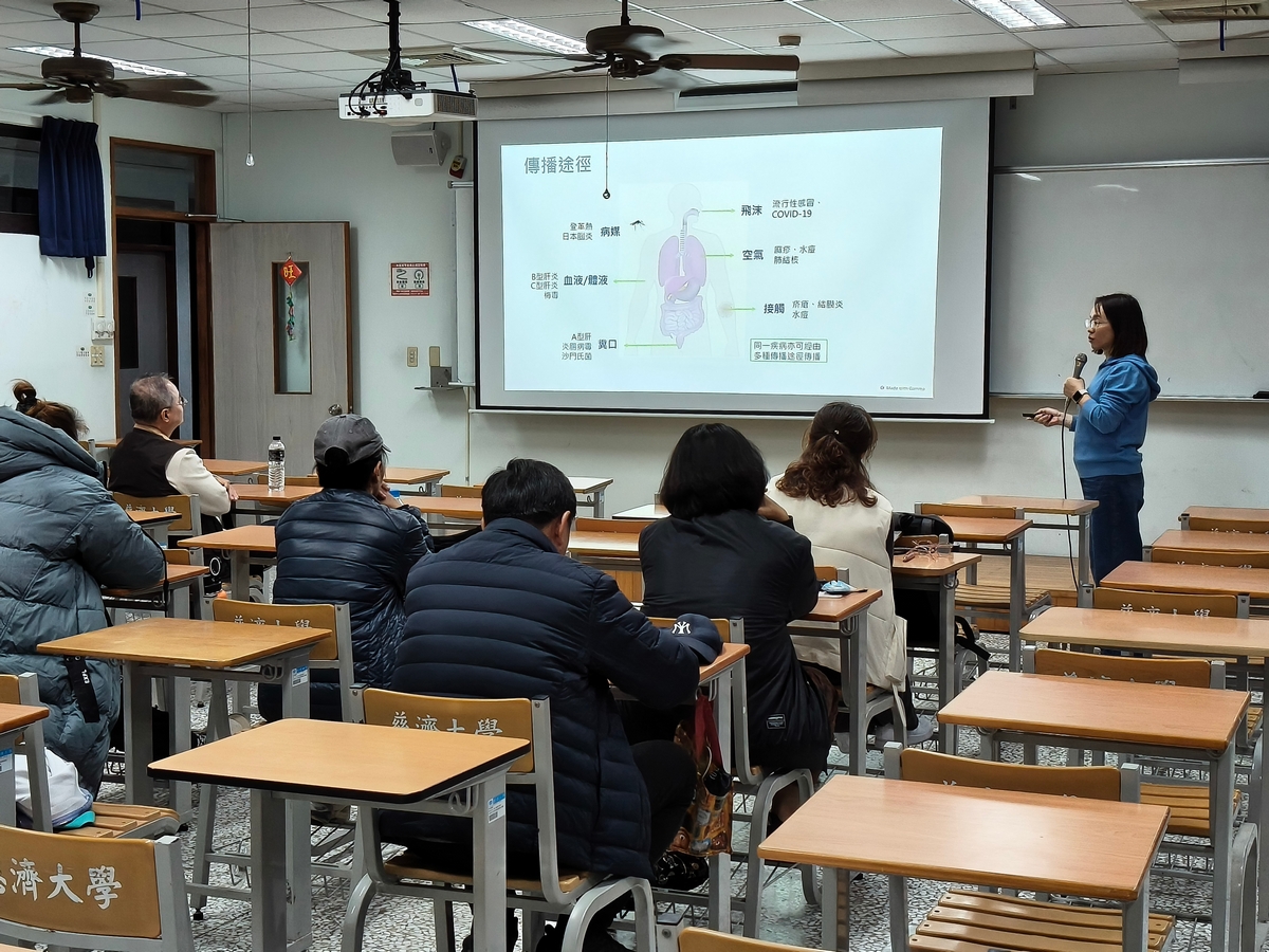 最後一堂「居家感染預防與自我保護」課程,由張淑萍講師說明傳染病的感染鏈、傳播途徑、臨床症狀、 防治觀念與標準防護措施,