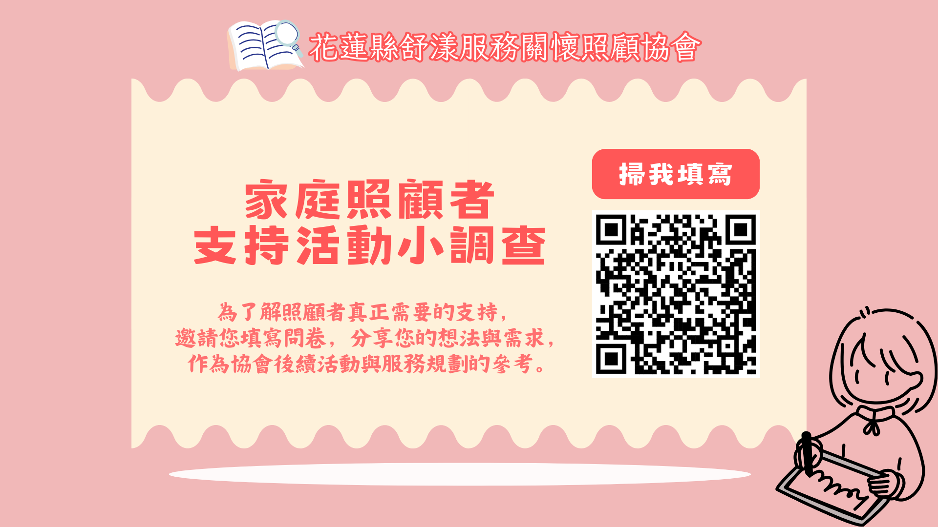 因此,誠摯邀請家庭照顧者與居服員填寫本次需求調查,分享您目前的實際想法與需求,作為協會後續規劃支持活動與工作坊的重要參考依據。